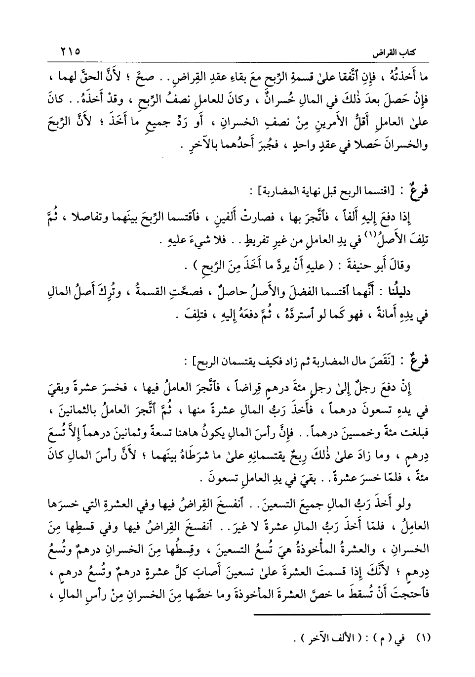 إن دفع رجل إلى رجل مائة درهم قراضا، فاتجر العامل فيها، فخسر عشرة وبقي في يده تسعون درهما، فأخذ رب المال عشرة منها، ثم اتجر العامل بالثمانين، فبلغت مائة وخمسين درها.. فإن رأس المال يكون هاهنا تسعة وثمانين درهما إلا تُسع درهم، وما زاد على ذلك ربح يقتسمانه على ما شرطاه بينهما؛ لأن رأس المال كان مائة، فلما خسر عشرة.. بقي في يد العامل تسعون.