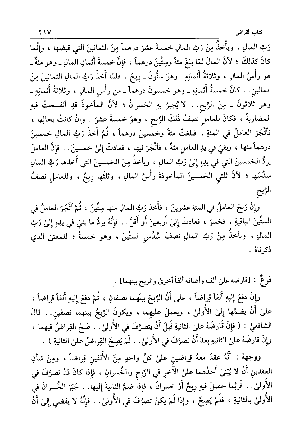 رب المال، ويأخذ من رب المال خمسة عشر درهما من الثمانين التي قبضها، وإنما كان كذلك؛ لأن المال لما بلغ مائة وستين درهما، فإن خمسة أثمان المال - وهو مائة هو رأس المال، وثلاثة أثمانه - وهو ستون - ربح، فلما أخذ رب المال الثمانين من المالين.. كان خمسة أثمانه - وهو خمسون درهما - من رأس المال، وثلاثة أثمانه - وهو ثلاثون - من الربح.. لا يجبر به الخسران؛ لأن المأخوذ قد انفسخت فيه المضاربة، فكان للعامل نصف ذلك الربح، وهو خمسة عشر. وأن كانت بحالها، فاتجر العامل في المائة، فبلغت مائة وخمسين درهما، ثم أخذ رب المال خمسين درهما منها، وبقي في يد العامل مائة، فاتجر فيها، فعادت إلى خمسين.. فإن العامل يرد الخمسين التي في يده إلى رب المال، ويأخذ من الخمسين التي أخذها رب المال سدسها؛ لأن ثلثي الخمسين المأخوذة رأس المال، وثلثها ربح، وللعامل نصف الربح.