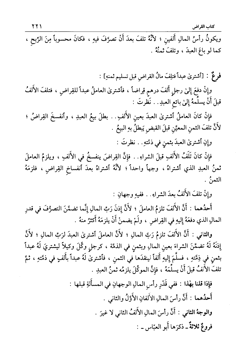 والثاني: أن الألف تلزم رب المال؛ لأن العامل اشترى العبد لرب المال؛ لأن إذنه له تضمن الشراء بعين المال وبثمن في الذمة، كرجل وكل وكيلا ليشتري له عبدا بثمن في ذمته، فسلم إليه ألفا لينقدها في الثمن، فاشترى له عبدا بألف في ذمته، ثم تلف الألف قبل أن يسلمه، فإن الموكل يلزمه ثمن العبد.