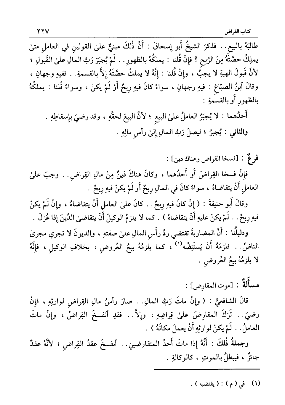 فإن فسخا القراض أو أحدهما، وكان هناك دين من مال القراض.. وجب على العامل أن يتقاضاه، سواء كان في المال ربح أو لم يكن فيه ربح.