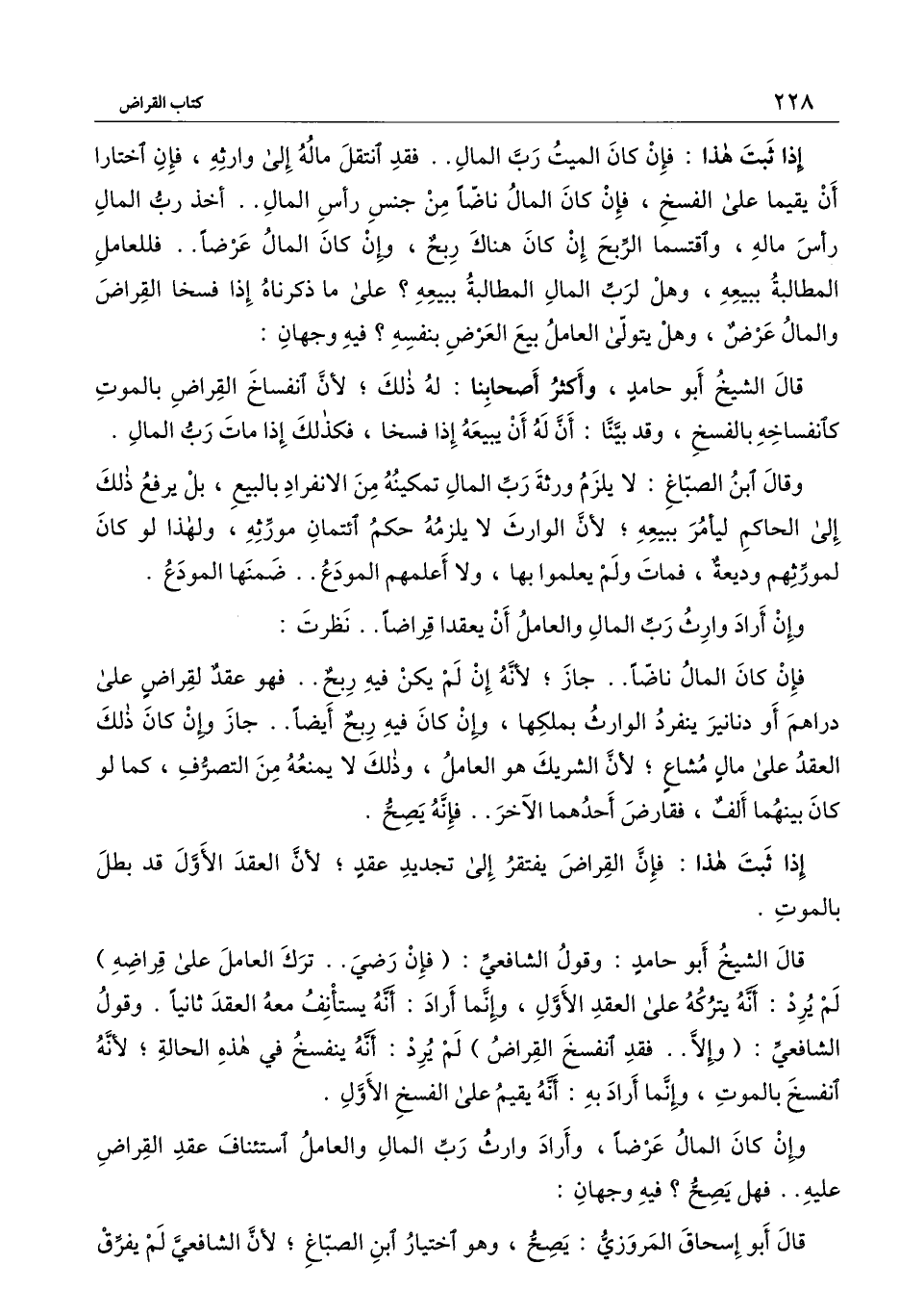 قال الشيخ أبو حامد: وقول الشافعي: (فإن رضي.. ترك العامل على قراضه) لم يرد: أنه يتركه على العقد الأول، وإنما أراد: أنه يستأنف معه العقد ثانيا. وقول الشافعي: (وإلا.. فقد انفسخ القراض) لم يرد: أنه ينفسخ في هذه الحالة؛ لأنه انفسخ بالموت، وإنما أراد به: أنه يقيم على الفسخ الأول.