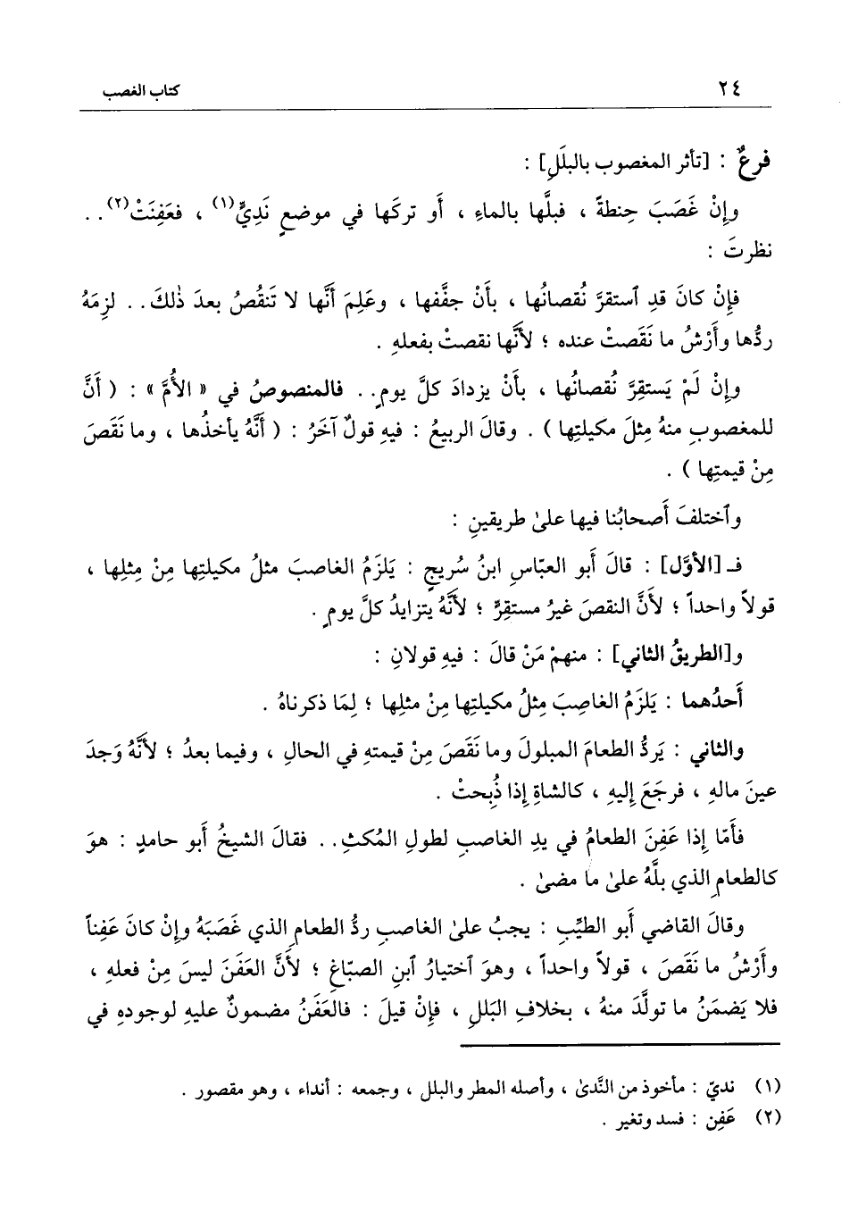 فـ ـ[الأول] : قال أبو العباس ابن سريج: يلزم الغاصب مثل مكيلتها من مثلها، قولا واحداً؛ لأن النقص غير مستقر؛ لأنه يتزايد كل يوم.