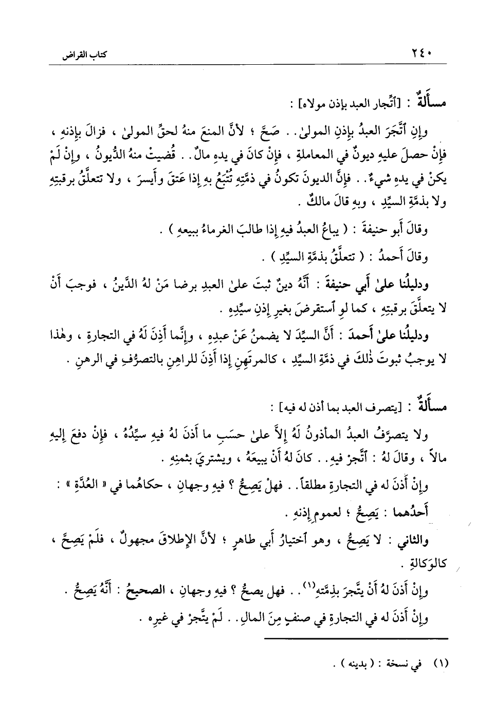 وإن أذن له أن يتجر بذمته.. فهل يصح؟ فيه وجهان، الصحيح: أنه يصح. وإن أذن له في التجارة في صنف من المال.. لم يتجر في غيره.
