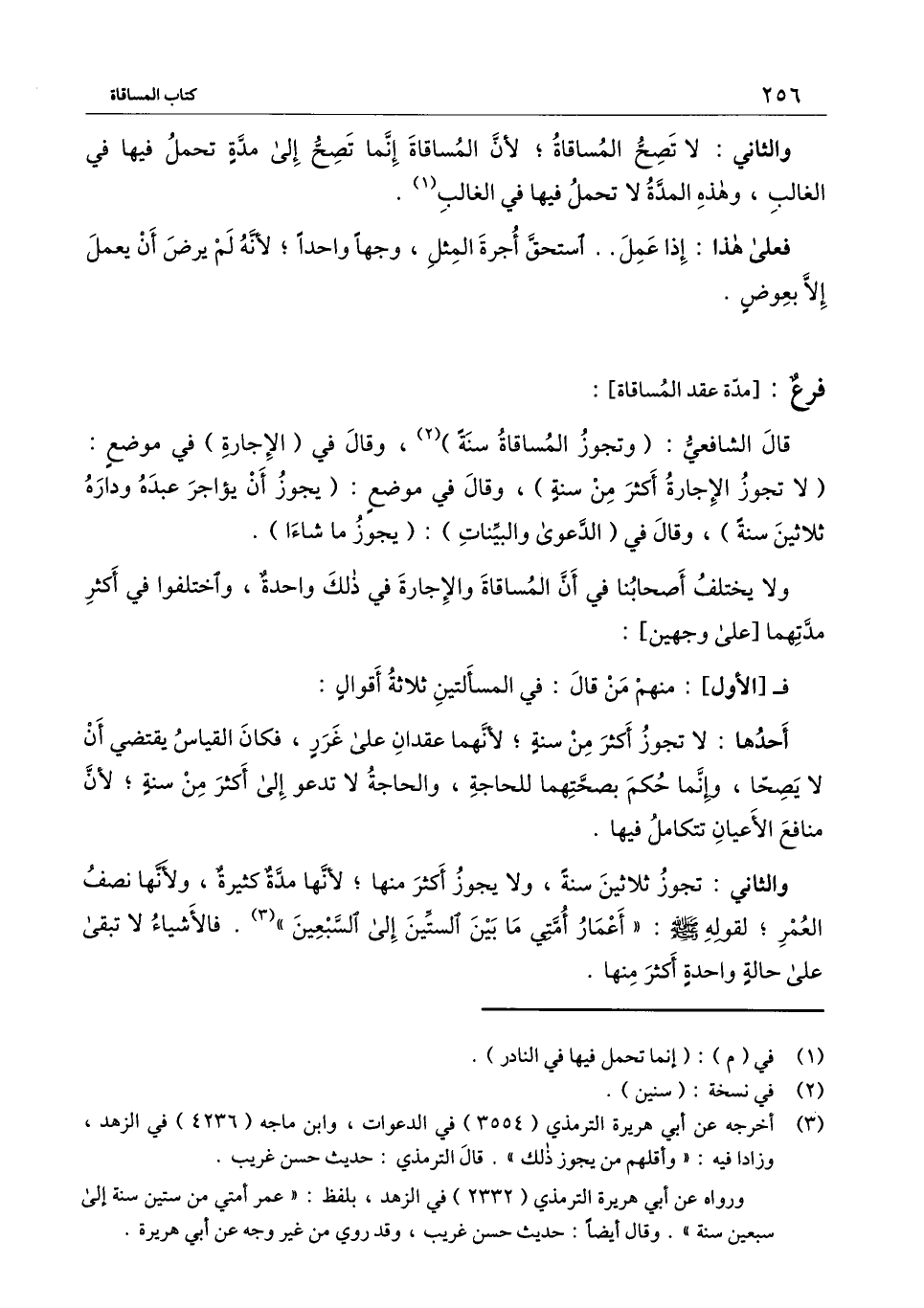 ولا يختلف أصحابنا في أن المساقاة والإجارة في ذلك واحدة، واختلفوا في أكثر مدتهما [على وجهين] :