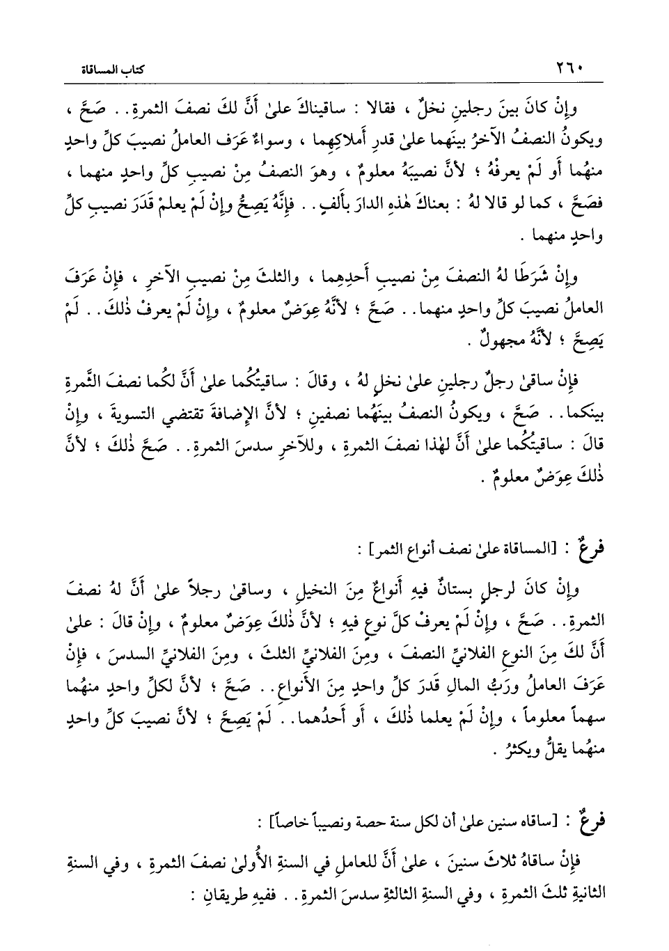 ] : وإن كان لرجل بستان فيه أنواع من النخيل، وساقى رجلًا على أن له نصف الثمرة.. صح، وإن لم يعرف كل نوع فيه؛ لأن ذلك عوض معلوم، وإن قال: على أن لك من النوع الفلاني النصف، ومن الفلاني الثلث، ومن الفلاني السدس، فإن عرف العامل ورب المال قدر كل واحد من الأنواع.. صح؛ لأن لكل واحد منهما سهمًا معلومًا، وإن لم يعلما ذلك، أو أحدهما.. لم يصح؛ لأن نصيب كل واحد منهما يقل ويكثر.