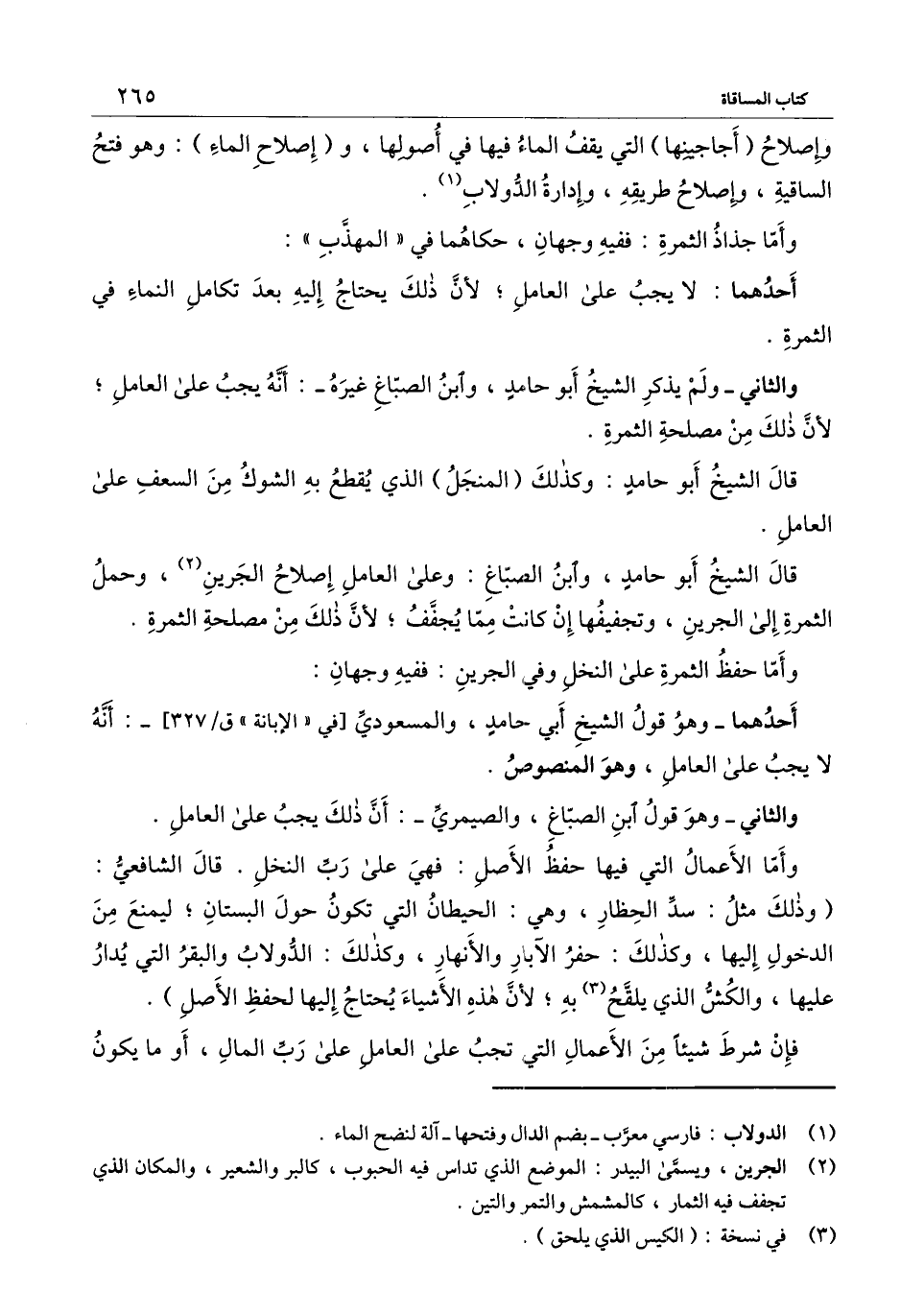 والثاني - وهو قول ابن الصباغ، والصيمري -: أن ذلك يجب على العامل. وأما الأعمال التي فيها حفظ الأصل: فهي على رب النخل. قال الشافعي: (وذلك مثل: سد الحظار، وهي: الحيطان التي تكون حول البستان؛ ليمنع من الدخول إليها، وكذلك: حفر الآبار والأنهار، وكذلك: الدولاب والبقر التي يدار عليها، والكش الذي يلقح به؛ لأن هذه الأشياء يحتاج إليها لحفظ الأصل) .
