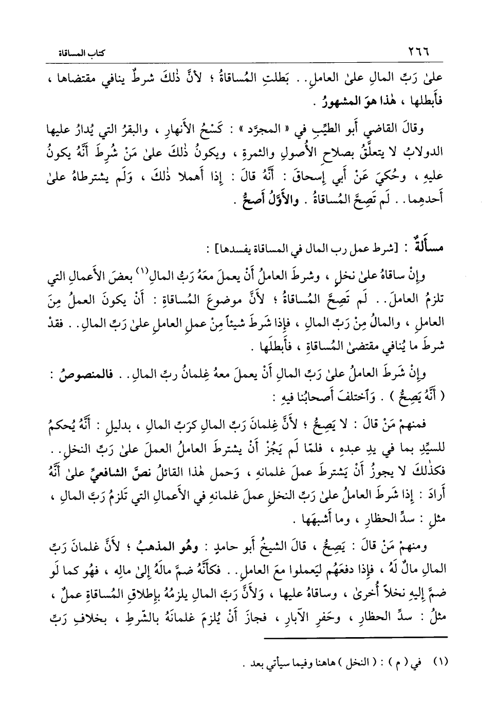 ومنهم من قال: يصح، قال الشيخ أبو حامد: وهو المذهب؛ لأن غلمان رب المال مال له، فإذا دفعهم ليعملوا مع العامل.. فكأنه ضم ماله إلى ماله، فهو كما لو ضم إليه نخلًا أخرى، وساقاه عليها، ولأن رب المال يلزمه بإطلاق المساقاة عمل، مثل: سد الحظار، وحفر الآبار، فجاز أن يلزم غلمانه بالشرط، بخلاف رب