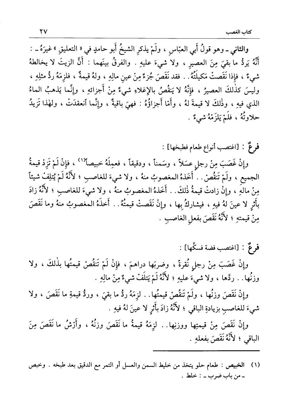 ] : وإن غصب من رجل عسلا، وسمناً، ودقيقاً، فعمله خبيصاً، فإن لم تزد قيمة الجميع، ولم تنقص.. أخذه المغصوب منه، ولا شيء للغاصب؛ لأنه لم يتلف شيئا من ماله، وإن زادت قيمة ذلك.. أخذه المغصوب منه، ولا شيء للغاصب؛ لأنه زاد بأثر لا عين له فيه، فيشارك بها، وإن نقصت قيمته.. أخذه المغصوب منه وما نقص من قيمته؛ لأنه نقص بفعل الغاصب.