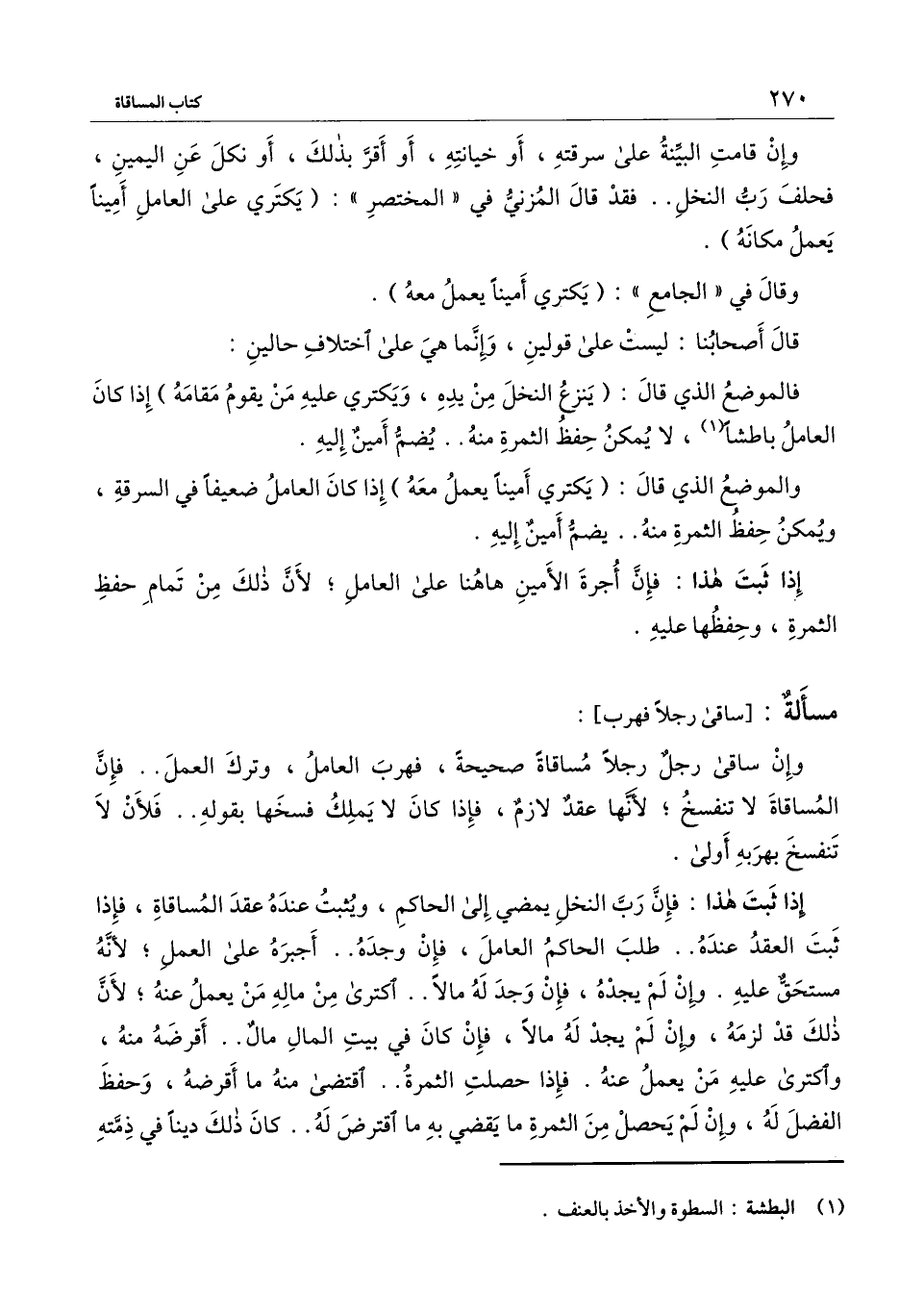 فالموضع الذي قال: (ينزع النخل من يده، ويكتري عليه من يقوم مقامه) إذا كان العامل باطشًا، لا يمكن حفظ الثمرة منه.. يضم أمين إليه.