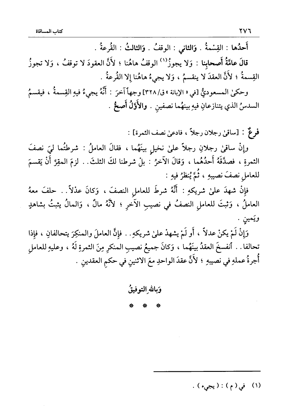 ] : وإن ساقى رجلان رجلًا على نخيل بينهما، فقال العامل: شرطتما لي نصف الثمرة، فصدقه أحدهما، وقال الآخر: بل شرطنا لك الثلث.. لزم المقر أن يقسم للعامل نصف نصيبه، ثم ينظر فيه: