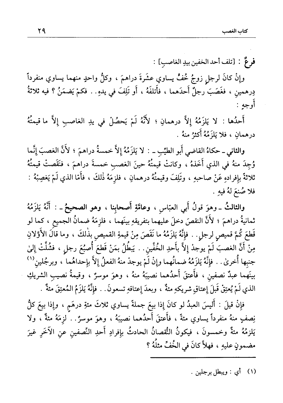 والثالث ـ وهو قول أبي العباس، وعامة أصحابنا، وهو الصحيح ـ: أنه يلزمه ثمانية دراهم؛ لأن النقص دخل عليهما بتفريقه بينهما، فلزمه ضمان الجميع، كما لو قطع كم قميص لرجل.. فإنه يلزمه ما نقص من قيمة القميص بذلك، وما قال الأولان من أن الغصب لم يوجد إلا بأحد الخفين.. يبطل بمن قطع أصبع رجل، فشلت إلى جنبها أخرى، فإنه يلزمه ضمانهما وإن لم يوجد منه الفعل إلا بإحداهما، وبرجلين بينهما عبد نصفين، فأعتق أحدهما نصيبه منه، وهو موسر، وقيمة نصيب الشريك الذي لم يعتق قبل إعتاق شريكه مائة، وبعد إعتاقه تسعون ... فإنه يلزم المعتق مائة.