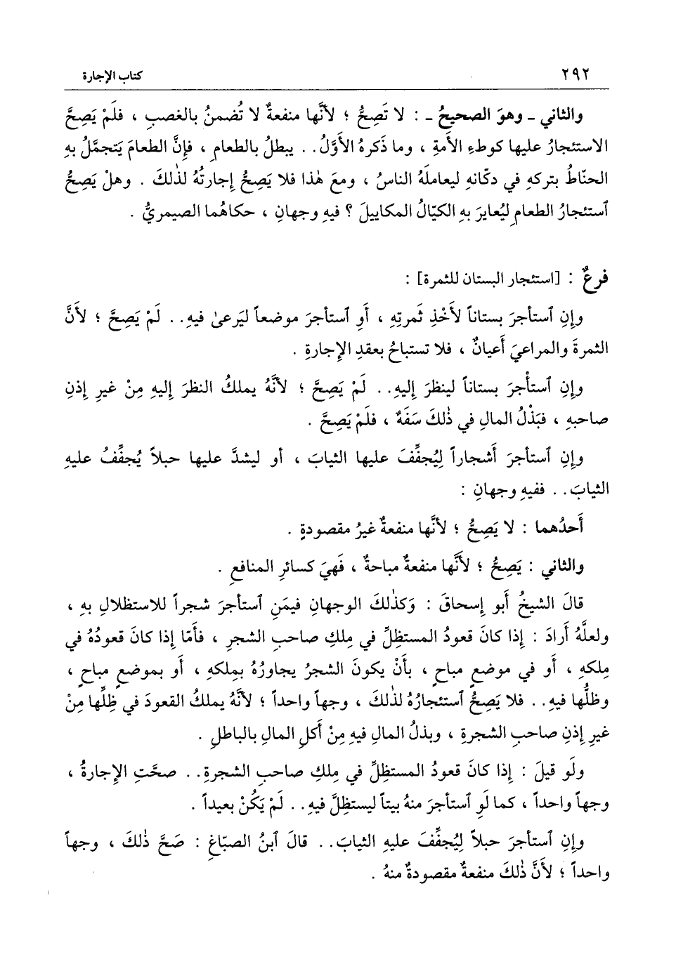 قال الشيخ أبو إسحاق: وكذلك الوجهان فيمن استأجر شجرًا للاستظلال به، ولعله أراد: إذا كان قعود المستظل في ملك صاحب الشجر، فأما إذا كان قعوده في ملكه، أو في موضع مباح، بأن يكون الشجر يجاوره بملكه، أو بموضع مباح، وظلها فيه.. فلا يصح استئجاره لذلك، وجهًا واحدًا؛ لأنه يملك القعود في ظلها من غير إذن صاحب الشجرة، وبذل المال فيه من أكل المال بالباطل.
