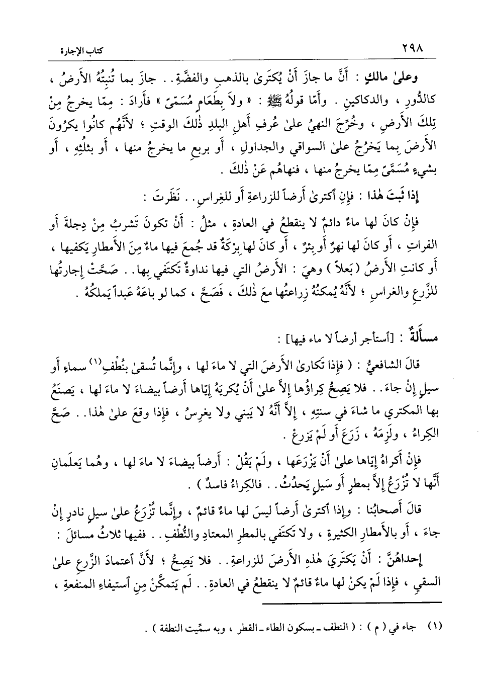 قال الشافعي: (فإذا تكارى الأرض التي لا ماء لها، وإنما تسقى بنطف سماء أو سيل إن جاء.. فلا يصح كراؤها إلا على أن يكريه إياها أرضًا بيضاء لا ماء لها، يصنع بها المكتري ما شاء في سنته، إلا أنه لا يبني ولا يغرس، فإذا وقع على هذا.. صح الكراء، ولزمه، زرع أو لم يزرع.