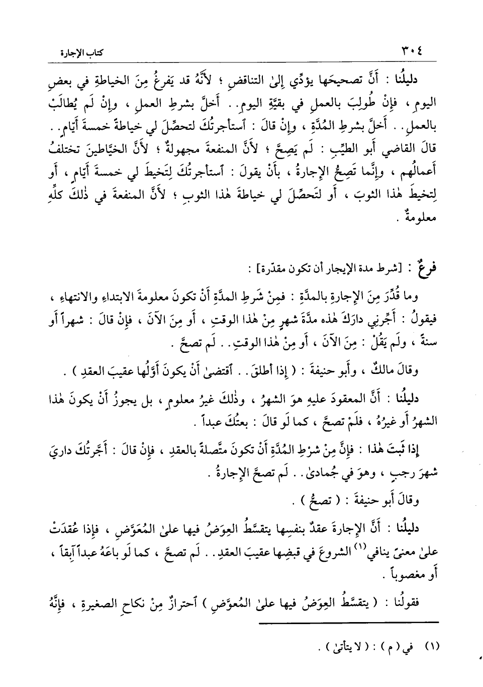 دليلنا: أن تصحيحها يؤدي إلى التناقض؛ لأنه قد يفرغ من الخياطة في بعض اليوم، فإن طولب بالعمل في بقية اليوم.. أخل بشرط العمل، وإن لم يطالب بالعمل.. أخل بشرط المدة، وإن قال: استأجرتك لتحصل لي خياطة خمسة أيام.. قال القاضي أبو الطيب: لم يصح؛ لأن المنفعة مجهولة؛ لأن الخياطين تختلف أعمالهم، وإنما تصح الإجارة، بأن يقول: استأجرتك لتخيط لي خمسة أيام، أو لتخيط هذا الثوب، أو لتحصل لي خياطة هذا الثوب؛ لأن المنفعة في ذلك كله معلومة.