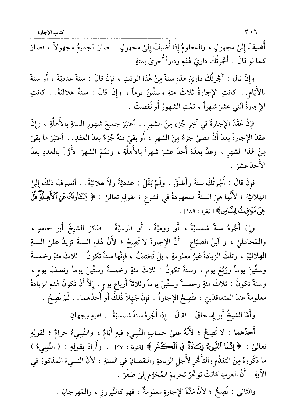 وإن أجره سنة شمسية، أو رومية، أو فارسية.. فذكر الشيخ أبو حامد، والمحاملي، وابن الصباغ: أن الإجارة لا تصح؛ لأن هذه السنة تزيد على السنة الهلالية، وتلك الزيادة غير معلومة، بل تختلف، فإنها سنة تكون: ثلاثمائة وخمسة وستين يومًا وربع يوم، وسنة تكون: ثلاثمائة وخمسة وستين يومًا ونصف يوم، وسنة تكون: ثلاثمائة وخمسة وستين يومًا وثلاثة أرباع يوم، إلا أن تكون هذه الزيادة معلومة عند المتعاقدين، فتصح الإجارة. فإن جهلا ذلك أو أحدهما.. لم تصح.