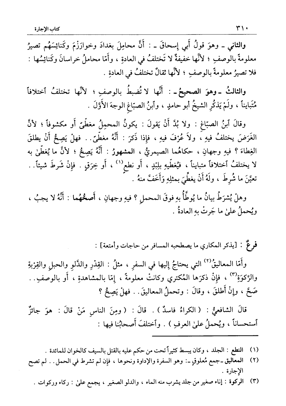 وأما المعاليق التي يحتاج إليها في السفر، مثل: القدر والدلو والحبل والقربة والركوة، فإن ذكرها المكتري وكانت معلومة، إما بالمشاهدة، أو بالوصف.. صح، وإن أطلق، وقال: وتحمل المعاليق.. فهل يصح؟