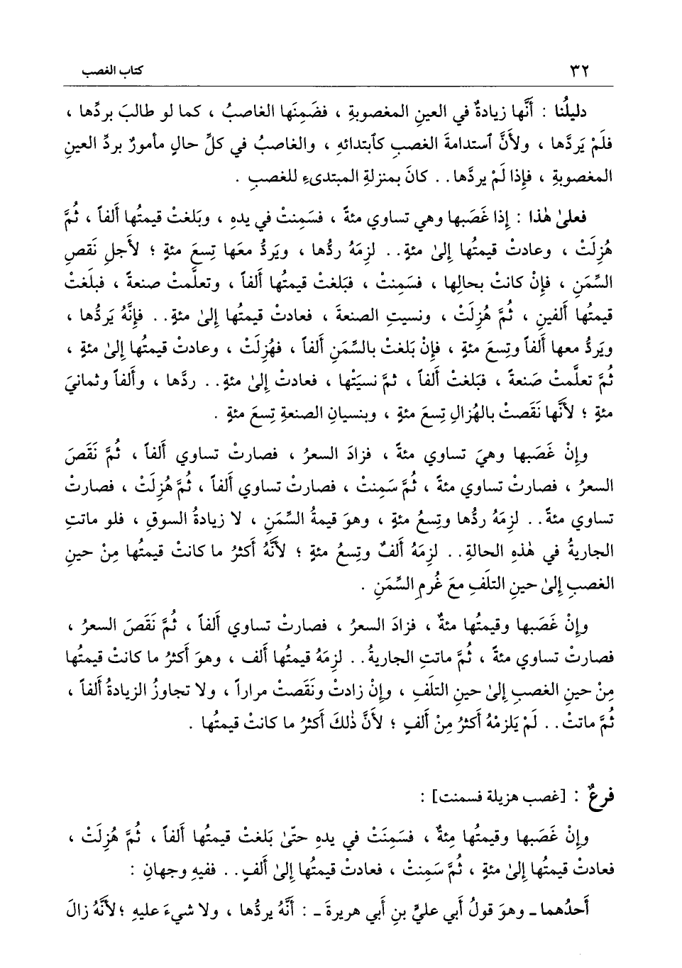 فعلى هذا: إذا غصبها وهي تساوي مائة، فسمنت في يده، وبلغت قيمتها ألفا، ثم هزلت، وعادت قيمتها إلى مائة.. لزمه ردها، ويرد معها تسعمائة؛ لأجل نقص السمن، فإن كانت بحالها، فسمنت، فبلغت قيمتها ألفا، وتعلمت صنعة، فبلغت قيمتها ألفين، ثم هزلت، ونسيت الصنعة، فعادت قيمتها إلى مائة.. فإنه يردها، ويرد معها ألفا وتسعمائة، فإن بلغت بالسمن ألفاً، فهزلت، وعادت قيمتها إلى مائة، ثم تعلمت صنعة، فبلغت ألفا، ثم نسيتها، فعادت إلى مائة.. ردها، وألفا وثمانمائة؛ لأنها نقصت بالهزال تسعمائة، وبنسيان الصنعة تسعمائة.