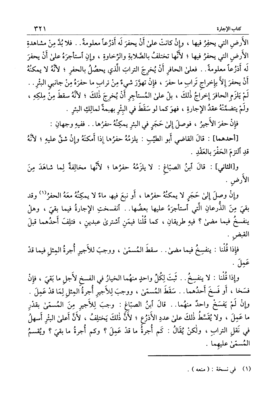 وإذا قلنا: لا ينفسخ.. ثبت لكل واحد منهما الخيار في الفسخ لأجل ما بقي، فإن فسخا، أو فسخ أحدهما.. سقط المسمى، ووجب للأجير أجرة المثل لما قد عمل. وإن لم يفسخ واحد منهما.. قال ابن الصباغ: وجب للأجير من المسمى بقدر ما عمل، ولا يقسط ذلك على عدد الأذرع؛ لأن ذلك يختلف، لأن أعلى البئر أسهل في نقل التراب، ولكن يقال: كم أجرة ما قد عمل؟ وكم أجرة ما بقي؟ ويقسم المسمى عليهما.
