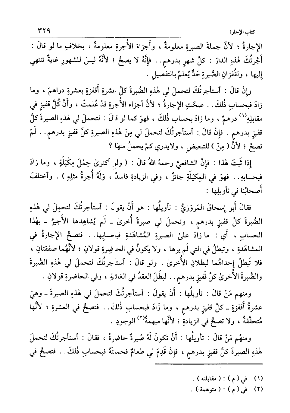 فقال أبو إسحاق المروزي: تأويلها: هو أن يقول: استأجرتك لتحمل لي هذه الصبرة كل قفيز بدرهم، وتحمل لي صبرة أخرى - لم يشاهدها الأجير - بهذا الحساب، أي: ما زاد على الصبرة المشاهدة فبحسابها.. فتصح الإجارة في المشاهدة، وتبطل في التي لم يرها، ولا يكون في الحاضرة قولان؛ لأنهما صفقتان، فلا تبطل إحداهما لبطلان الأخرى. ولو قال: استأجرتك لتحمل لي هذه الصبرة والصبرة الأخرى كل قفيز بدرهم.. لبطل العقد في الغائبة، وفي الحاضرة قولان.