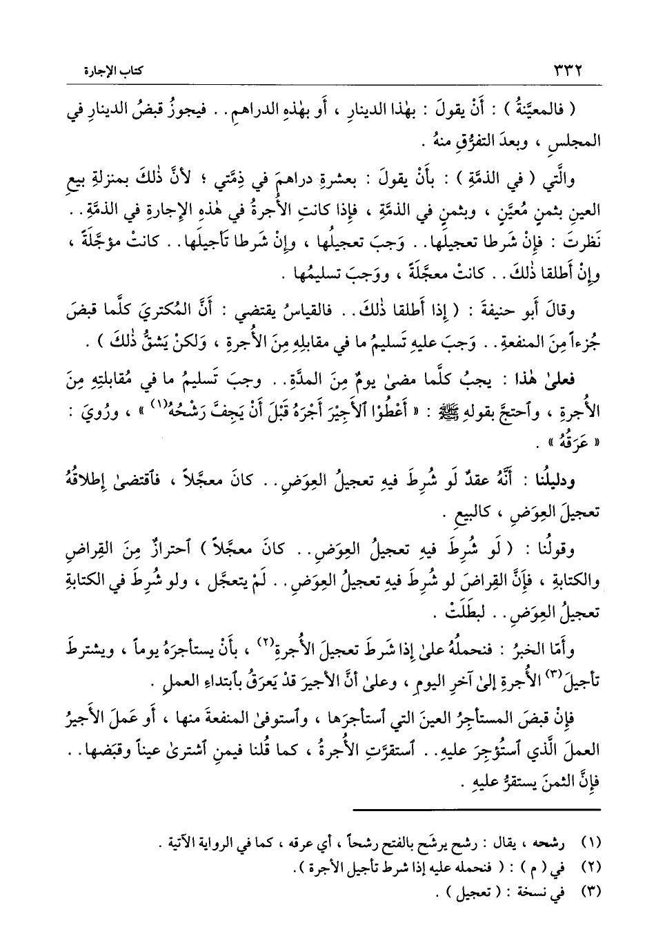 فعلى هذا: يجب كلما مضى يوم من المدة.. وجب تسليم ما في مقابلته من الأجرة، واحتج بقوله - صَلَّى اللَّهُ عَلَيْهِ وَسَلَّمَ -: «أعطوا الأجير أجره قبل أن يجف رشحه» ، وروي: (عرقه) .