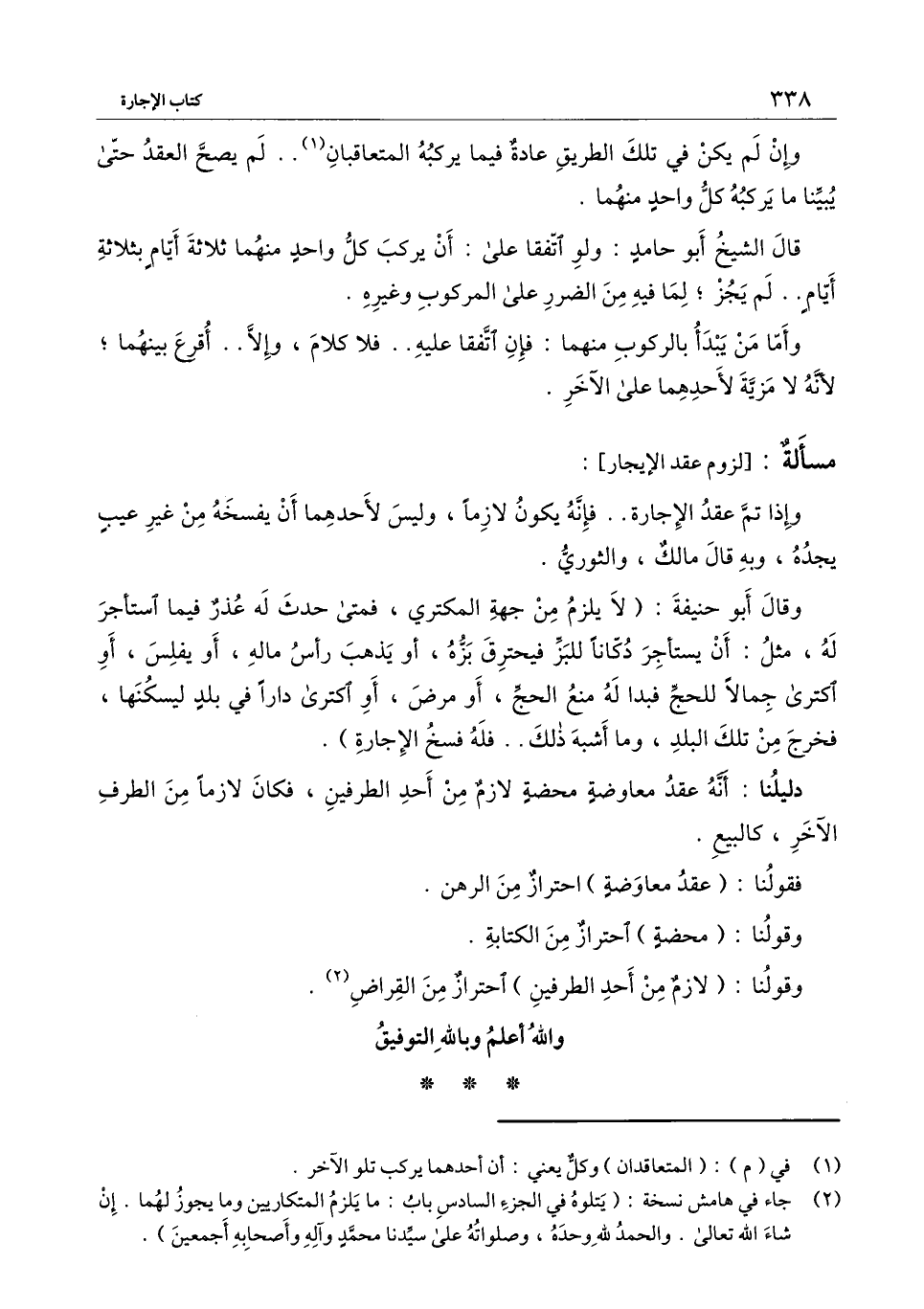 وإذا تم عقد الإجارة.. فإنه يكون لازمًا، وليس لأحدهما أن يفسخه من غير عيب يجده، وبه قال مالك، والثوري.