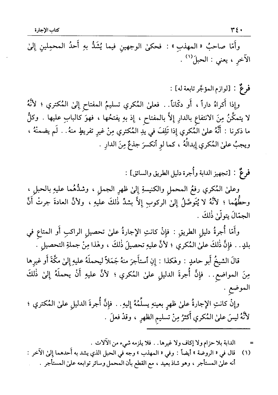 قال الشيخ أبو حامد: وهكذا إن استأجر منه جملًا ليحمله عليه إلى مكة أو غيرها من المواضع.. فإن أجرة الدليل على المكري؛ لأن عليه أن يحمله إلى ذلك الموضع.