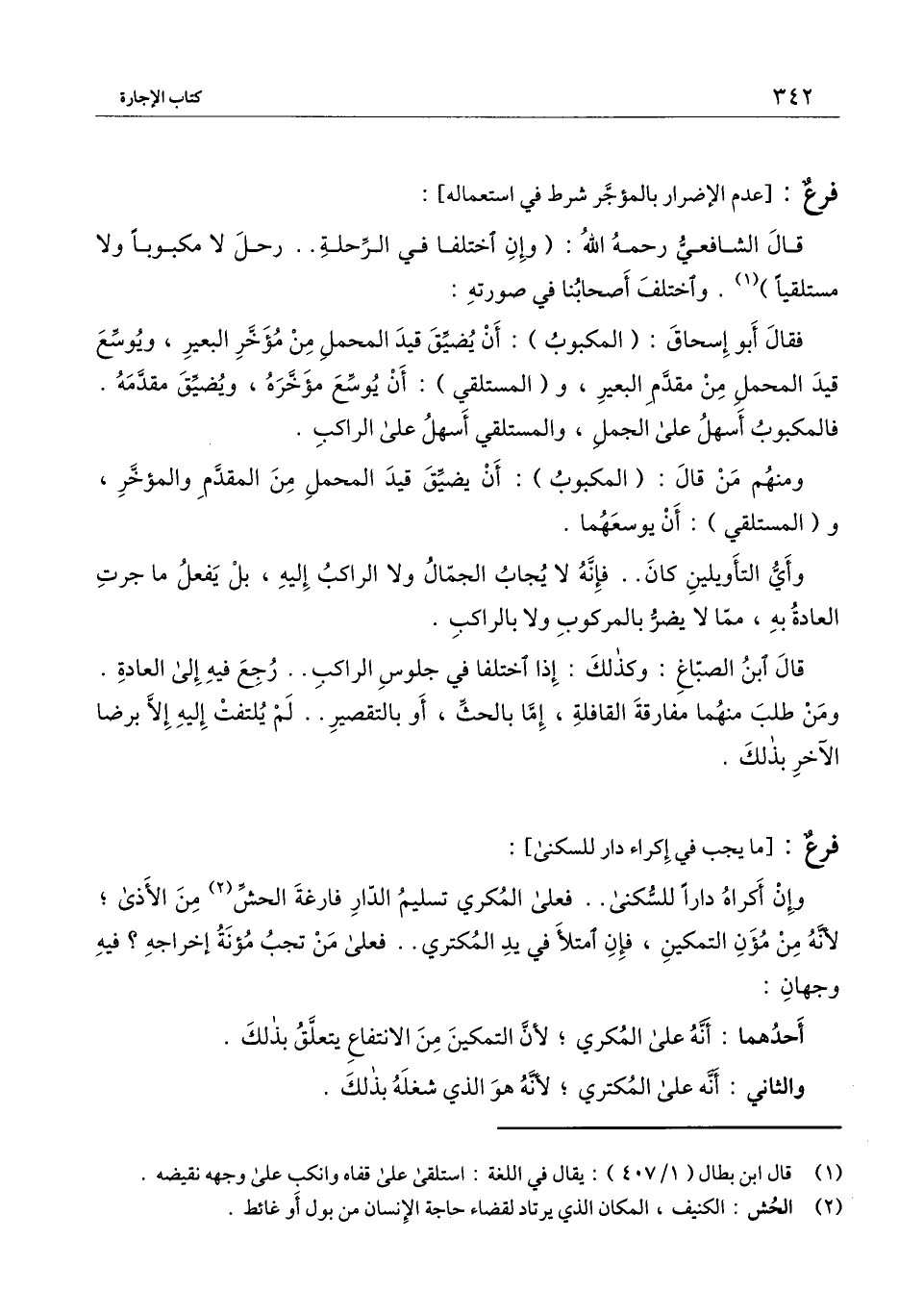 وأي التأويلين كان.. فإن لا يجاب الجمال ولا الراكب إليه، بل يفعل ما جرت العادة به، مما لا يضر بالمركوب ولا بالراكب.