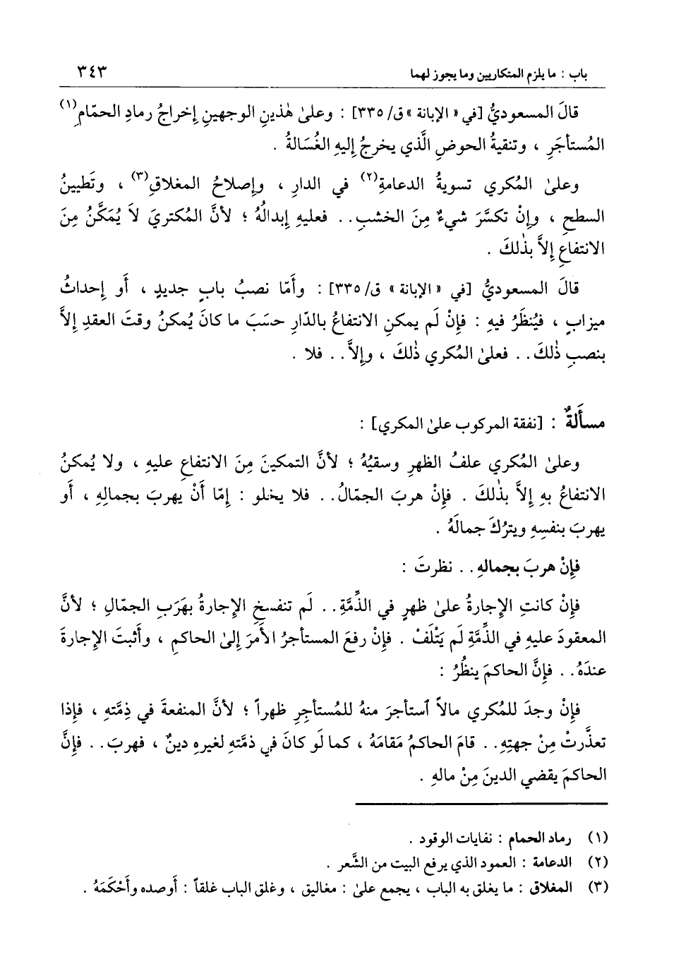 قال المسعودي [في " الإبانة " ق \ 335] : وأما نصب باب جديد، أو إحداث ميزاب، فينظر فيه: فإن لم يمكن الانتفاع بالدار حسب ما كان يمكن وقت العقد إلا بنصب ذلك.. فعلى المكري ذلك، وإلا.. فلا.
