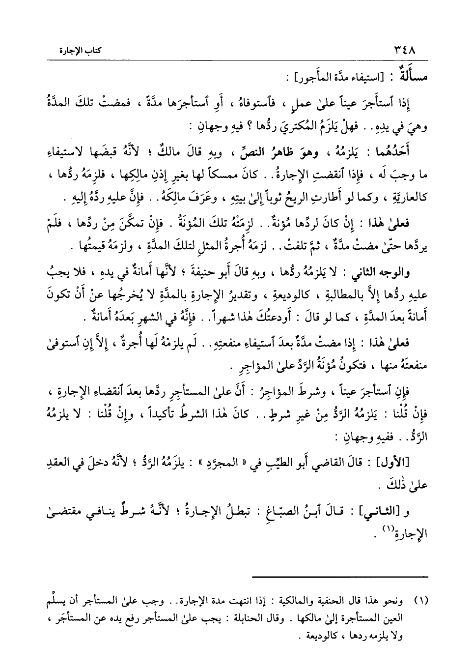 والوجه الثاني: لا يلزمه ردها، وبه قال أبو حنيفة؛ لأنها أمانة في يده، فلا يجب عليه ردها إلا بالمطالبة، كالوديعة، وتقدير الإجارة بالمدة لا يخرجها عن أن تكون أمانة بعد المدة، كما لو قال: أودعتك هذا شهرًا.. فإنه في الشهر بعده أمانة.