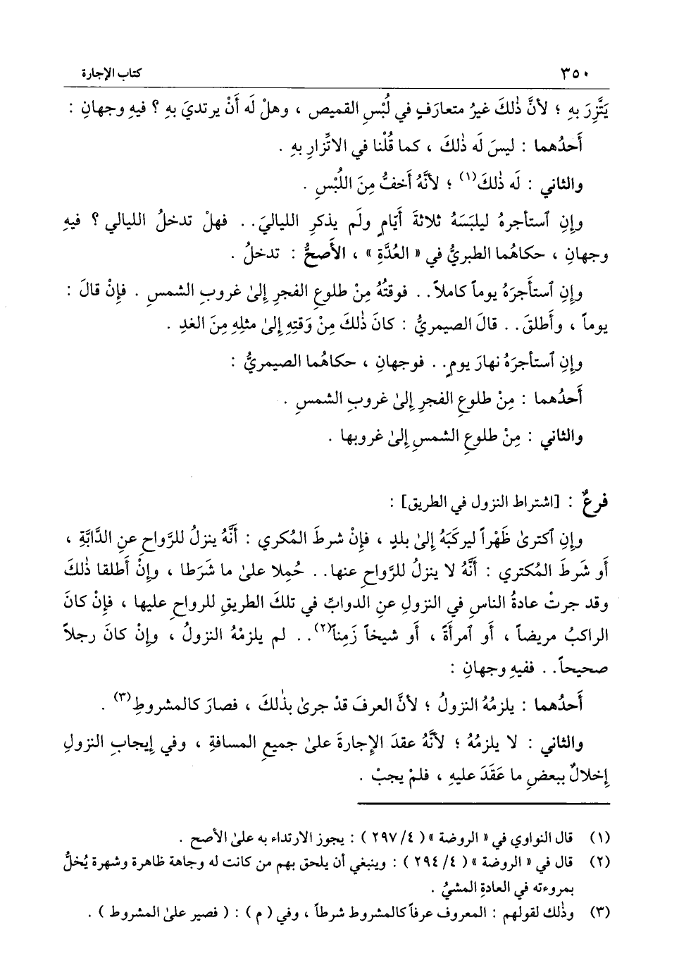 وإن اكترى ظهرًا ليركبه إلى بلد، فإن شرط المكري: أنه ينزل للرواح عن الدابة، أو شرط المكتري: أنه لا ينزل للرواح عنها.. حملا على ما شرطا، وإن أطلقا ذلك وقد جرت عادة الناس في النزول عن الدواب في تلك الطريق للرواح عليها، فإن كان الراكب مريضًا، أو امرأة، أو شيخًا زمنًا.. لم يلزمه النزول، وإن كان رجلًا صحيحًا.. ففيه وجهان: