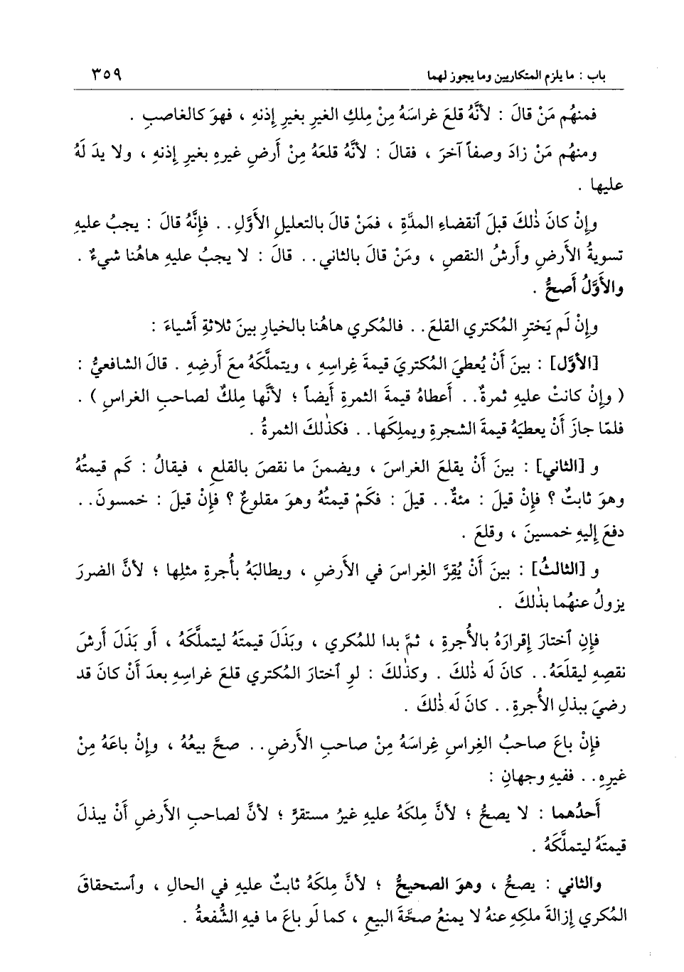 [الأول] : بين أن يعطي المكتري قيمة غراسه، ويتملكه مع أرضه. قال الشافعي: (وإن كانت عليه ثمرة.. أعطاه قيمة الثمرة أيضًا؛ لأنها ملك لصاحب الغراس) . فلما جاز أن يعطيه قيمة الشجرة ويملكها.. فكذلك الثمرة.
