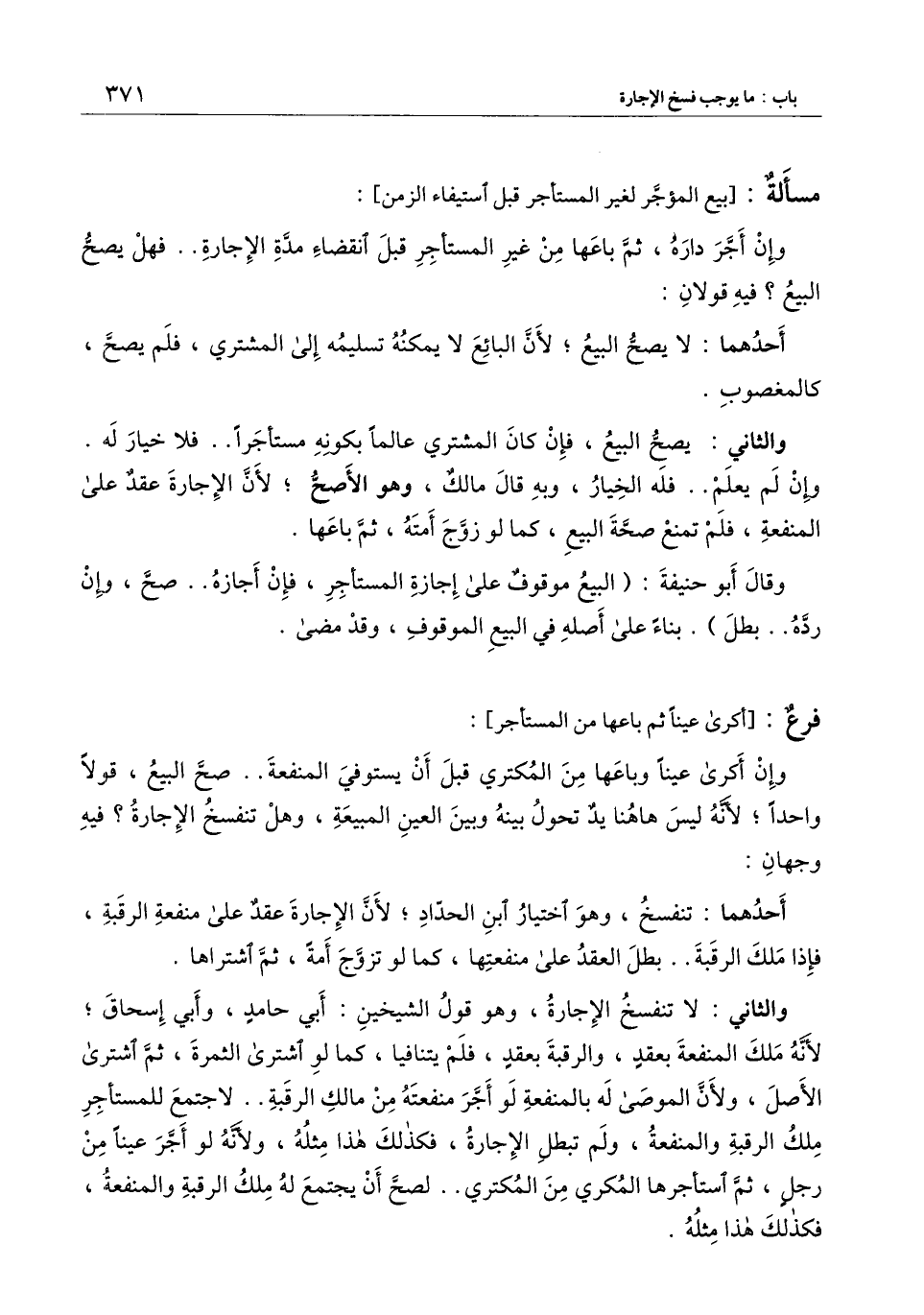 [مسألة: بيع المؤجر لغير المستأجر قبل استيفاء الزمن]