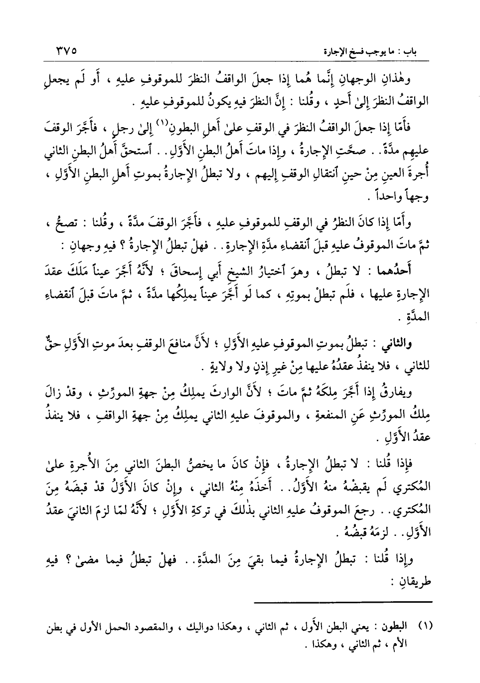وأما إذا كان النظر في الوقف للموقوف عليه، فأجر الوقف مدة، وقلنا: تصح، ثم مات الموقوف عليه قبل انقضاء مدة الإجارة.. فهل تبطل الإجارة؟ فيه وجهان: