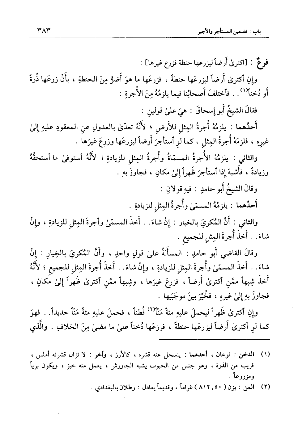] : وإن اكترى أرضًا ليزرعها حنطة، فزرعها ما هو أضر من الحنطة، بأن زرعها ذرة أو دخنًا.. فاختلف أصحابنا فيما يلزمه من الأجرة: