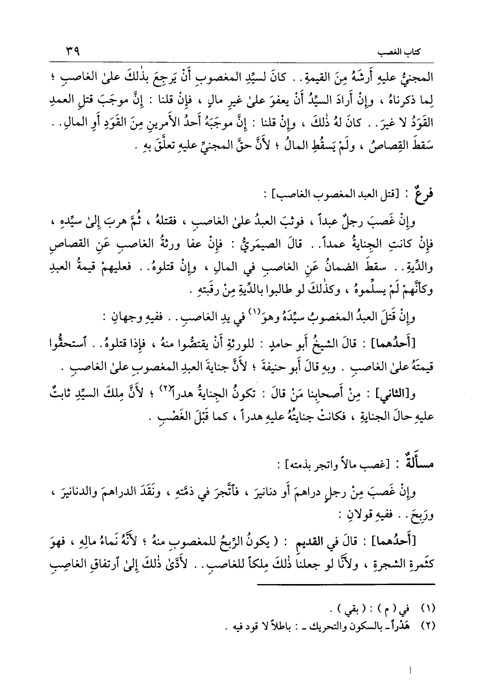 ] : وإن غصب رجل عبداً، فوثب العبد على الغاصب، فقتله، ثم هرب إلى سيده، فإن كانت الجناية عمداً.. قال الصيمري: فإن عفا ورثة الغاصب عن القصاص والدية.. سقط الضمان عن الغاصب في المال، وإن قتلوه.. فعليهم قيمة العبد وكأنهم لم يسلموه، وكذلك لو طالبوا بالدية من رقبته.