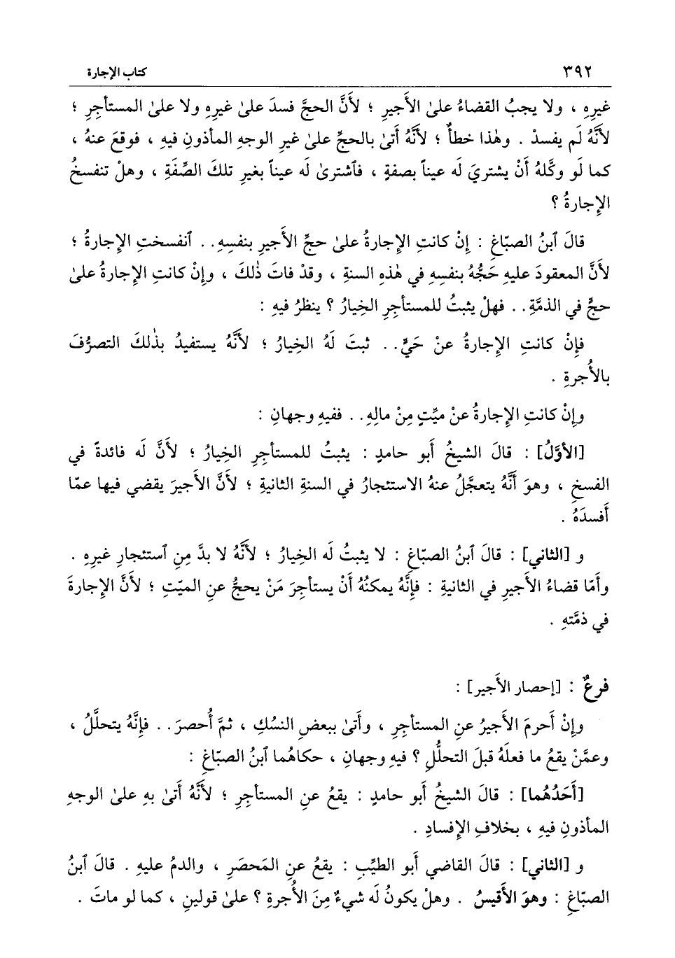غيره، ولا يجب القضاء على الأجير؛ لأن الحج فسد على غيره ولا على المستأجر؛ لأنه لم يفسد. وهذا خطأ؛ لأنه أتى بالحج على غير الوجه المأذون فيه، فوقع عنه، كما لو وكله أن يشتري له عينًا بصفة، فاشترى له عينًا بغير تلك الصفة، وهل تنفسخ الإجارة؟