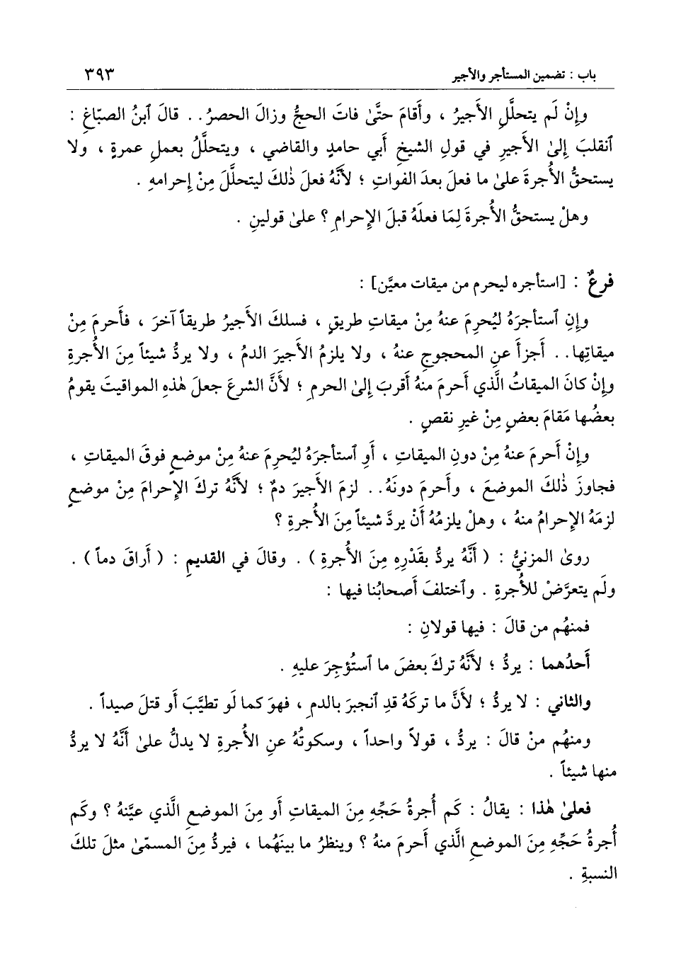 وإن استأجره ليحرم عنه من ميقات طريق، فسلك الأجير طريقًا آخر، فأحرم من ميقاتها.. أجزأ عن المحجوج عنه، ولا يلزم الأجير الدم، ولا يرد شيئًا من الأجرة وإن كان الميقات الذي أحرم منه أقرب إلى الحرم؛ لأن الشرع جعل هذه المواقيت يقوم بعضها مقام بعض من غير نقص.