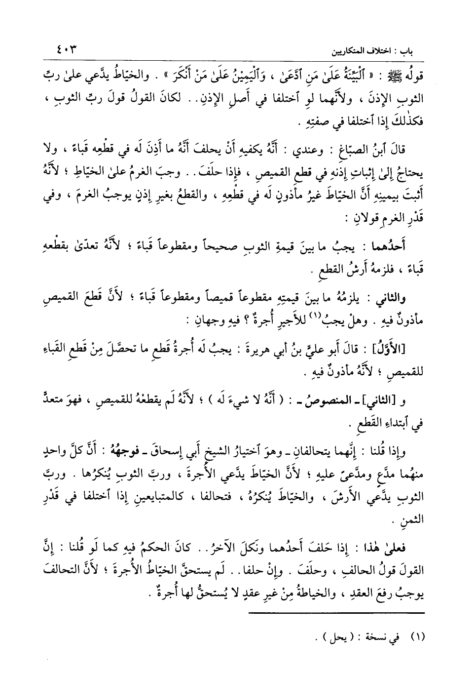 وإذا قلنا: إنهما يتحالفان ـ وهو اختيار الشيخ أبي إسحاق ـ فوجهه: أن كل واحد منهما مدع ومدعى عليه؛ لأنه الخياط يدعي الأجرة، ورب الثوب ينكرها. ورب الثوب يدعي الأرش، والخياط ينكره، فتحالفا، كالمتبايعين إذا اختلفا في قدر الثمن.