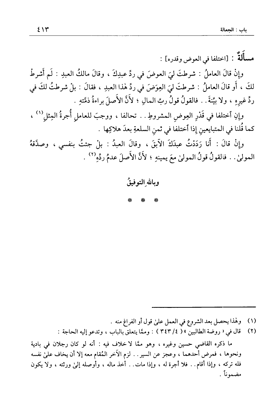 وإن قال العامل: شرطت لي العوض في رد عبدك، وقال مالك العبد: لم أشرط لك، أو قال العامل: شرطت لي العوض في رد هذا العبد، فقال: بل شرطت لك في رد غيره، ولا بينة.. فالقول قول رب المال؛ لأن الأصل براءة ذمته.