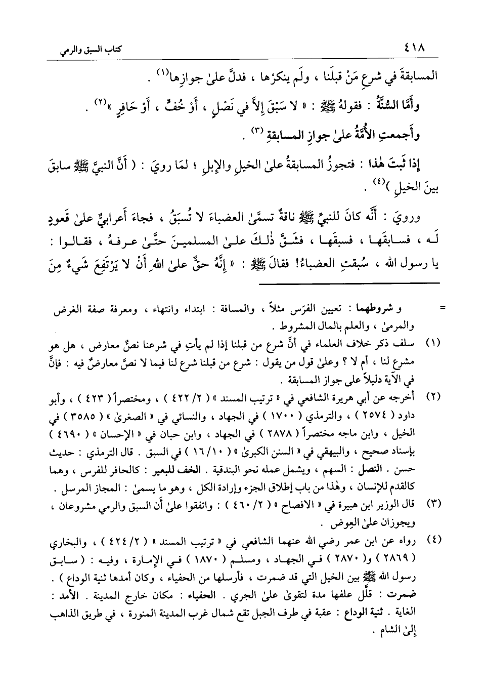 وأما السنة: فقوله - صَلَّى اللَّهُ عَلَيْهِ وَسَلَّمَ -: «لا سبق إلا في نصل، أو خف، أو حافر» .