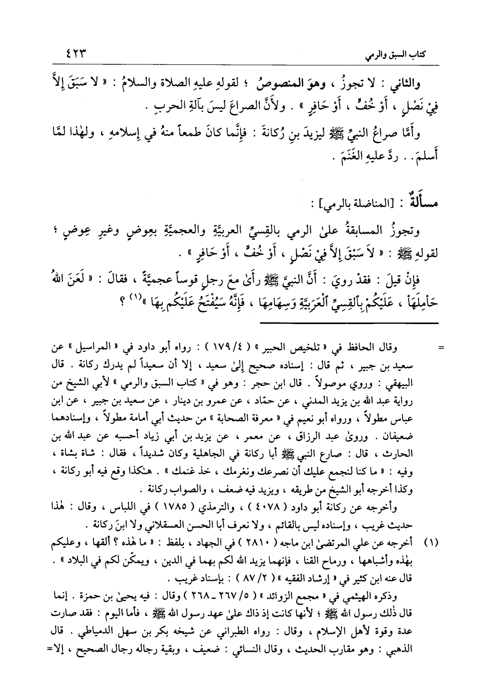 وتجوز المسابقة على الرمي بالقسي العربية والعجمية بعوض وغير عوض؛ لقوله - صَلَّى اللَّهُ عَلَيْهِ وَسَلَّمَ -: «لا سبق إلا في نصل، أو خف، أو حافر» .