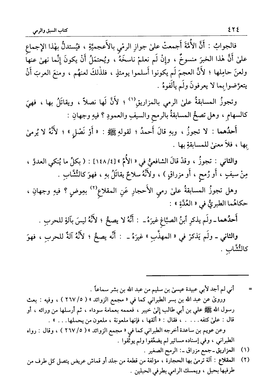 وهل تجوز المسابقة على رمي الأحجار عن المقلاع بعوض؟ فيه وجهان، حكاهما الطبري في (العدة) :
