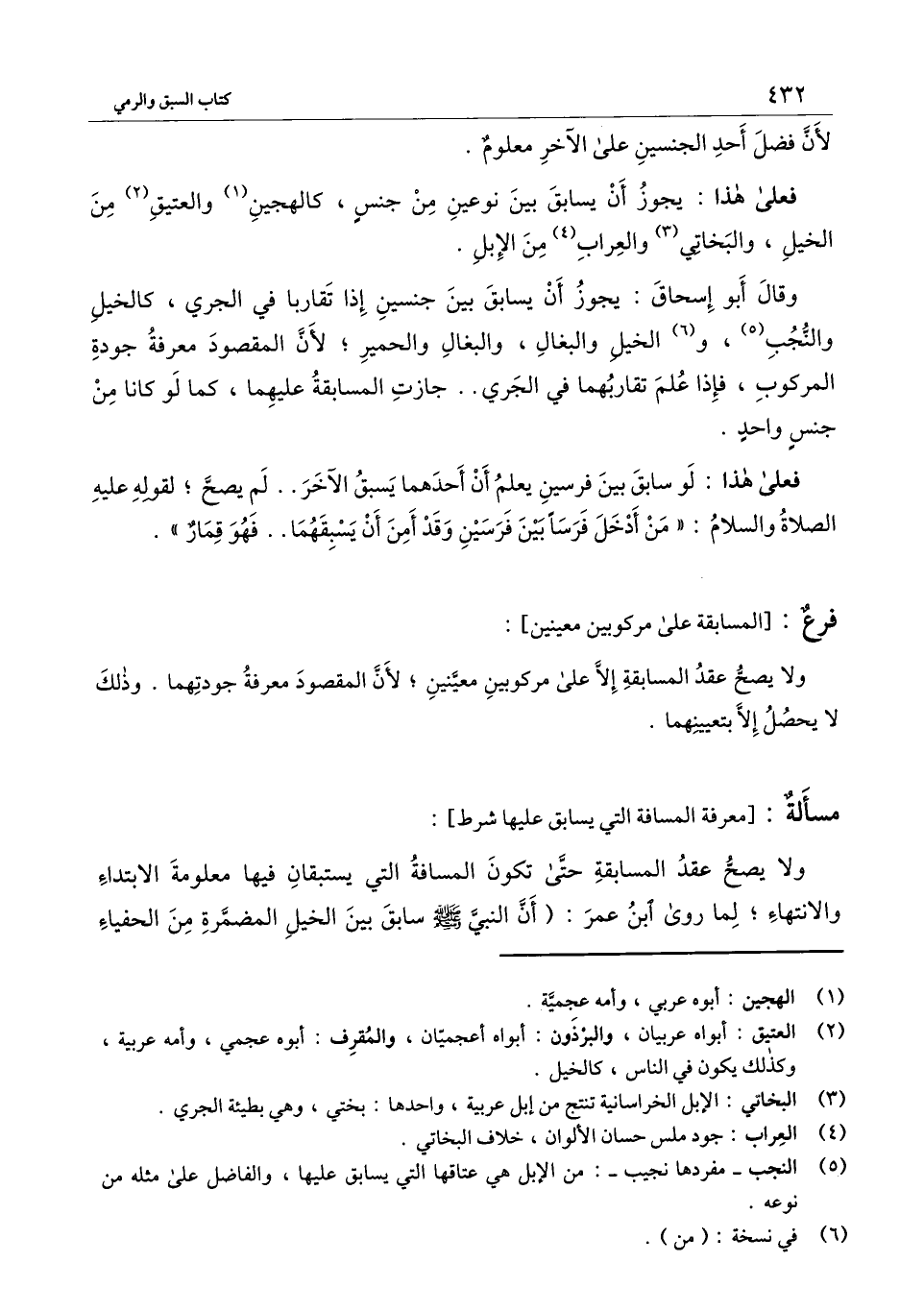 فعلى هذا: يجوز أن يسابق بين نوعين من جنس، كالهجين والعتيق من الخيل، والبخاتي والعراب من الإبل.
