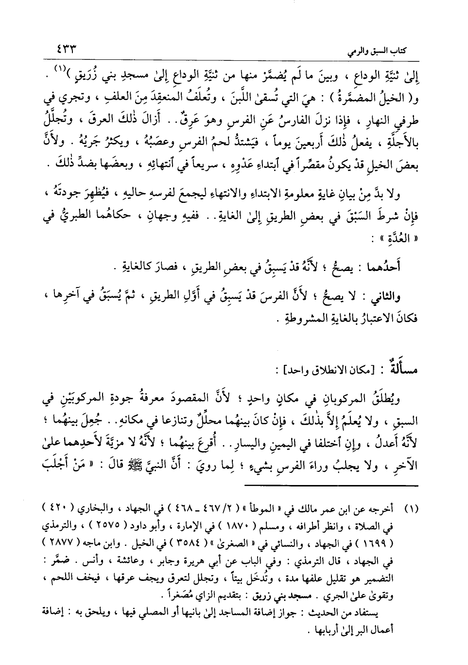 إلى ثنية الوداع، وبين ما لم يضمر منها من ثنية الوداع إلى مسجد بني زريق» . و (الخيل المضمرة) : هي التي تسقى اللبن، وتعلف المنعقد من العلف، وتجري في طرفي النهار، فإذا نزل الفارس عن الفرس وهو عرق.. أزال ذلك العرق، وتجلل بالأجلة، يفعل ذلك أربعين يومًا، فيشتد لحم الفرس وعصبه، ويكثر جريه. ولأن بعض الخيل قد يكون مقصرًا في ابتداء عدوه، سريعًا في انتهائه، وبعضها بضد ذلك.