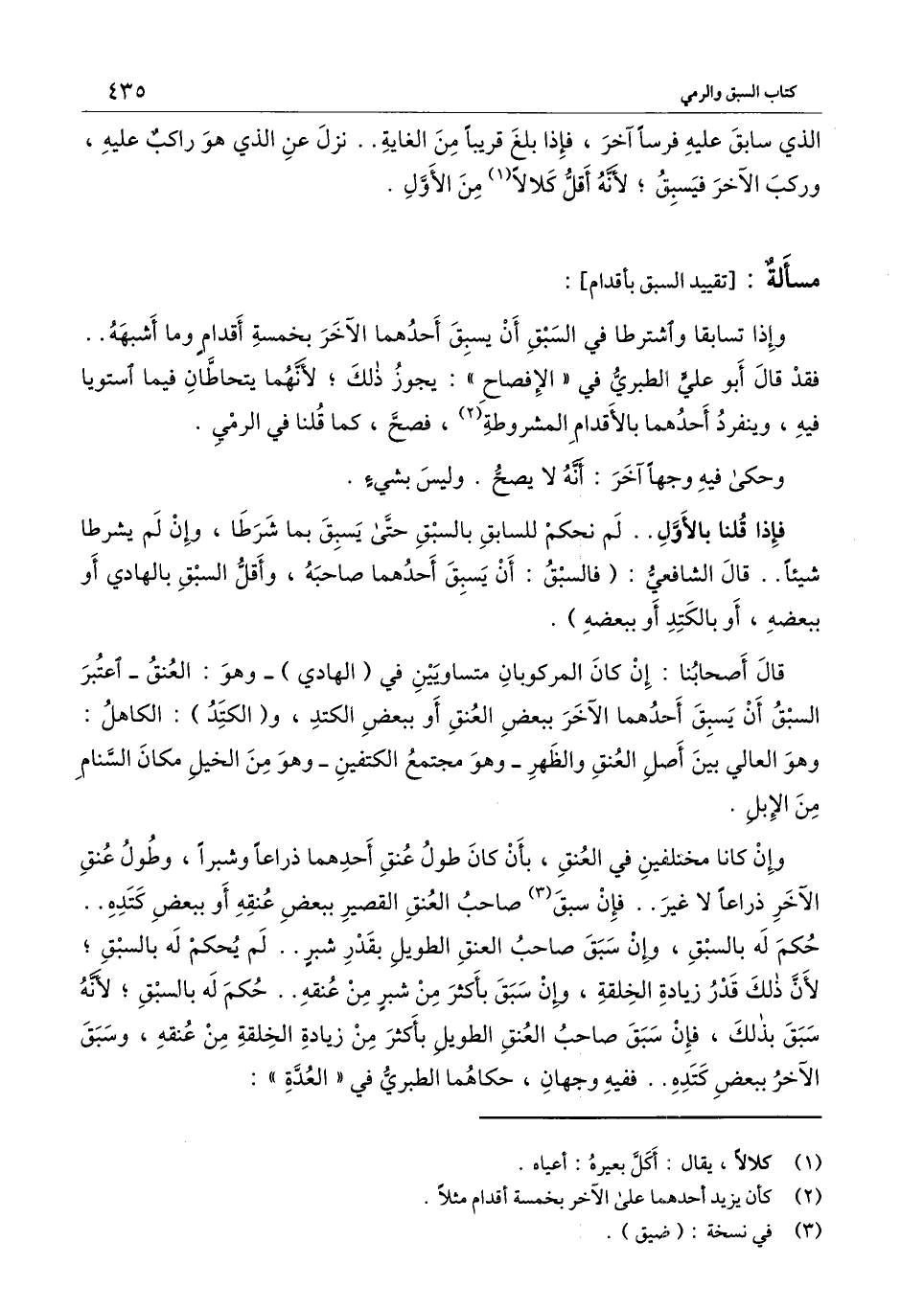قال أصحابنا: إن كان المركوبان متساويين في (الهادي) ـ وهو: العنق ـ اعتبر السبق أن يسبق أحدهما الآخر ببعض العنق أو ببعض الكتد، و (الكتد) : الكاهل: وهو العالي بين أصل العنق والظهر ـ وهو مجتمع الكتفين ـ وهو من الخيل مكان السنام من الإبل.