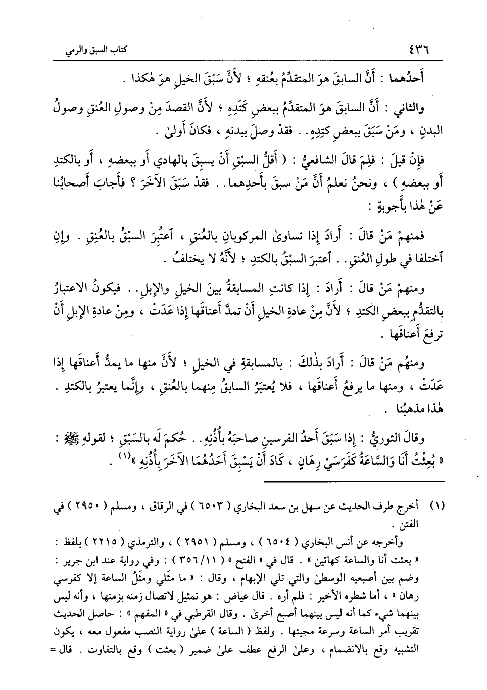 ومنهم من قال: أراد: إذا كانت المسابقة بين الخيل والإبل.. فيكون الاعتبار بالتقدم ببعض الكتد؛ لأن من عادة الخيل أن تمد أعناقها إذا عدت، ومن عادة الإبل أن ترفع أعناقها.