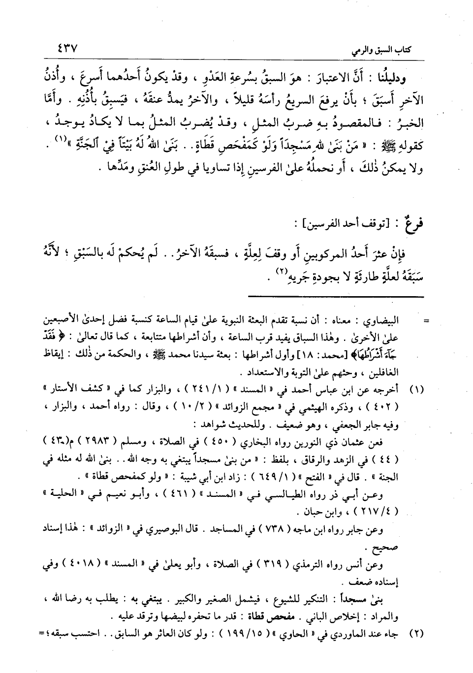 ودليلنا: أن الاعتبار: هو السبق بسرعة العدو، وقد يكون أحدهما أسرع، وأذن الآخر أسبق؛ بأن يرفع السريع رأسه قليلًا، والآخر يمد عنقه، فيسبق بأذنه. وأما الخبر: فالمقصود به ضرب المثل، وقد يضرب المثل بما لا يكاد يوجد، كقوله - صَلَّى اللَّهُ عَلَيْهِ وَسَلَّمَ -: «من بنى لله مسجدًا ولو كمفحص قطاة.. بنى الله له بيتا في الجنة» . ولا يمكن ذلك، أو نحمله على الفرسين إذا تساويا في طول العنق ومدها.