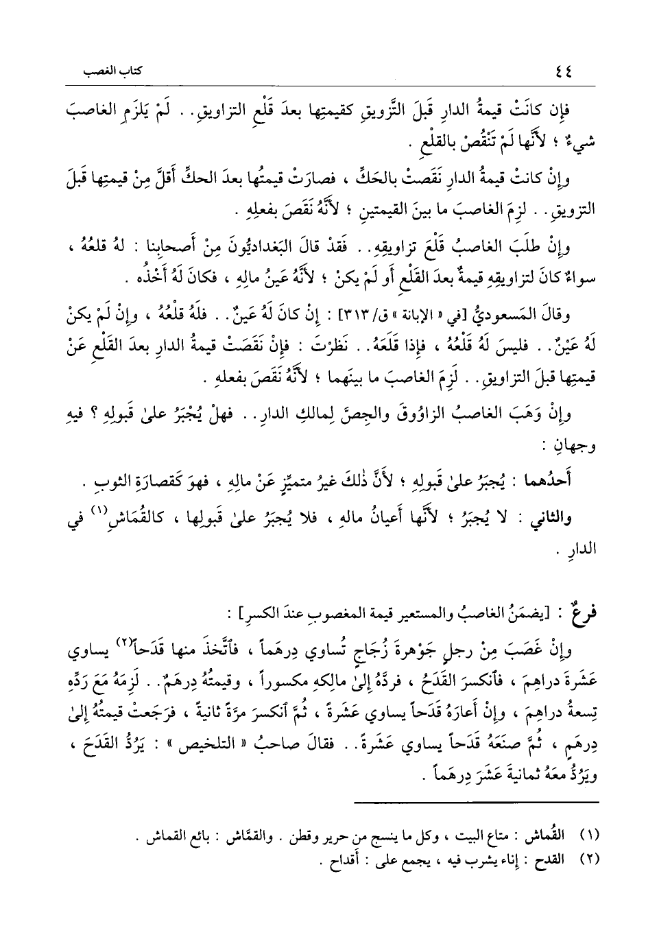 فإن كانت قيمة الدار قبل التزويق كقيمتها بعد قلع التزاويق.. لم يلزم الغاصب شيء؛ لأنها لم تنقص بالقلع..
