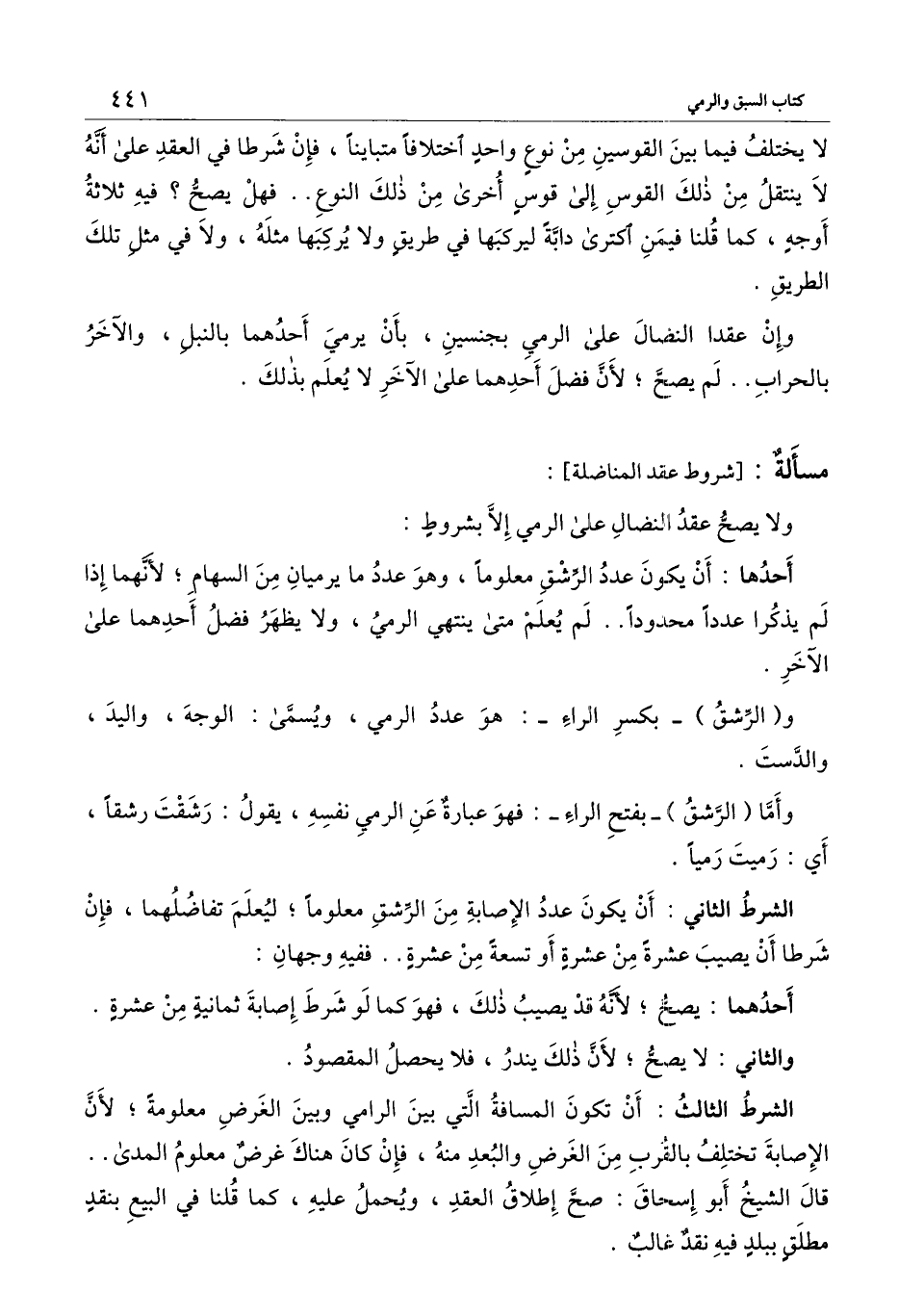 ولا يصح عقد النضال على الرمي إلا بشروط: