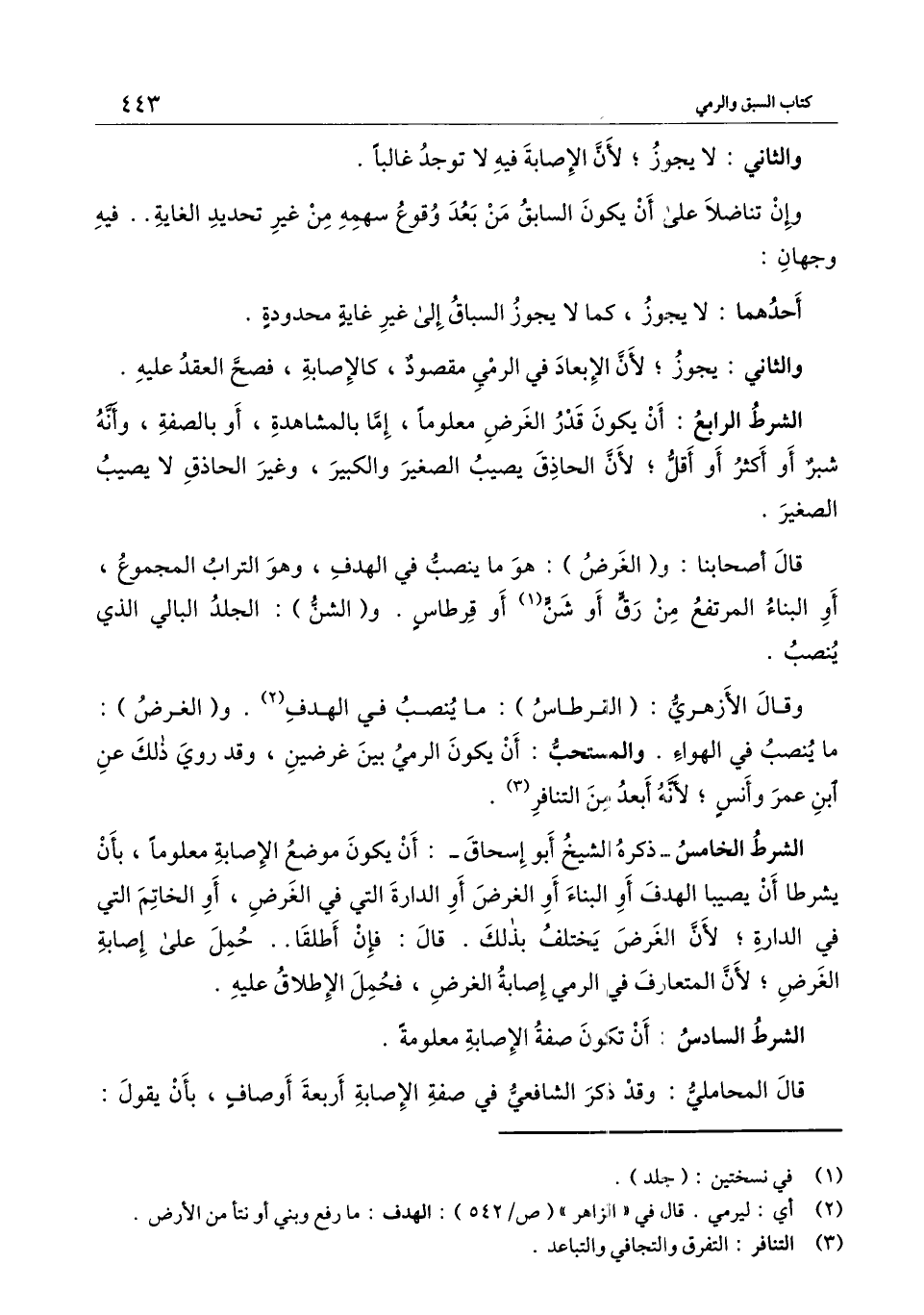 الشرط الرابع: أن يكون قدر الغرض معلومًا، إما بالمشاهدة، أو بالصفة، وأنه شبر أو أكثر أو أقل؛ لأن الحاذق يصيب الصغير والكبير، وغير الحاذق لا يصيب الصغير.
